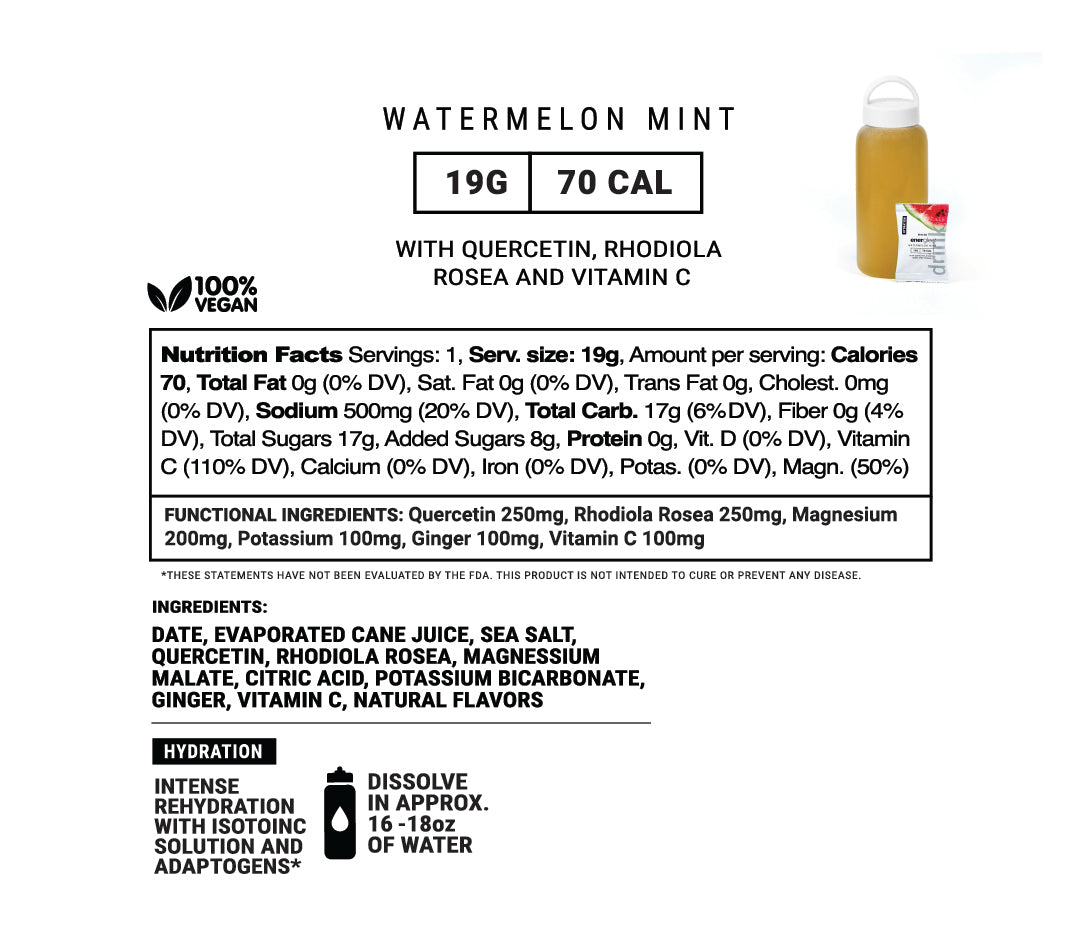 Enhance your hydration and elevate your performance with our Watermelon Mint Hydration Drink mix. This superior formula combines the natural sweetness of dates and evaporated cane juice with a carefully selected mix of electrolytes and performance-enhancing botanicals. Featuring a unique blend of mint, ginger, and watermelon flavors, this product is crafted to provide optimal hydration while also supporting endurance and recovery. With added benefits from Rhodiola Rosea and Quercetin, it’s the perfect drink for athletes and anyone needing a refreshing boost to their daily hydration.